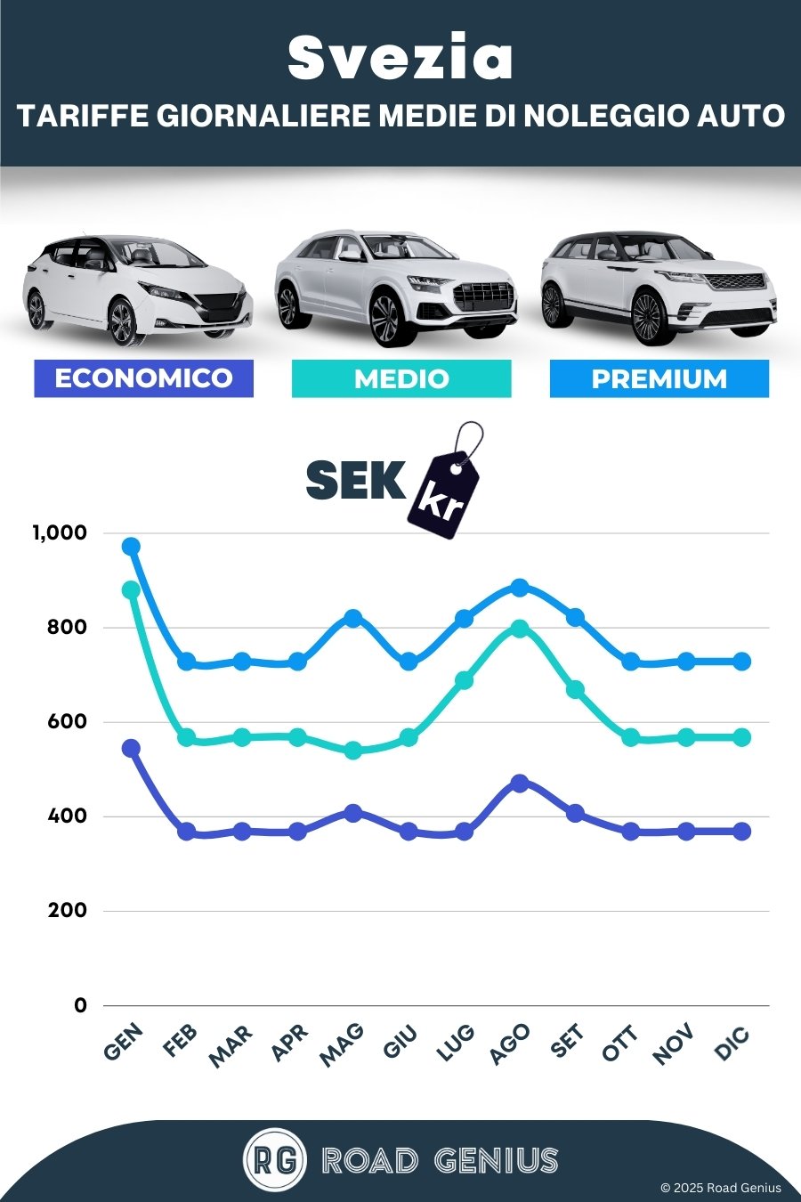 In media, il noleggio auto in Svezia costa circa 604 kr al giorno, con tariffe a partire da 369 kr al giorno.