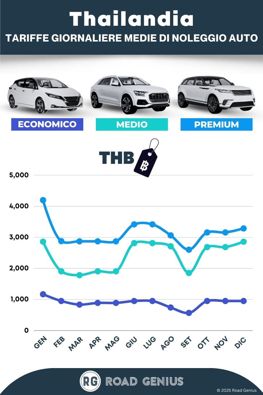 In media, il noleggio auto in Thailandia costa circa THB ฿2.150 al giorno, con tariffe a partire da THB ฿566 al giorno.