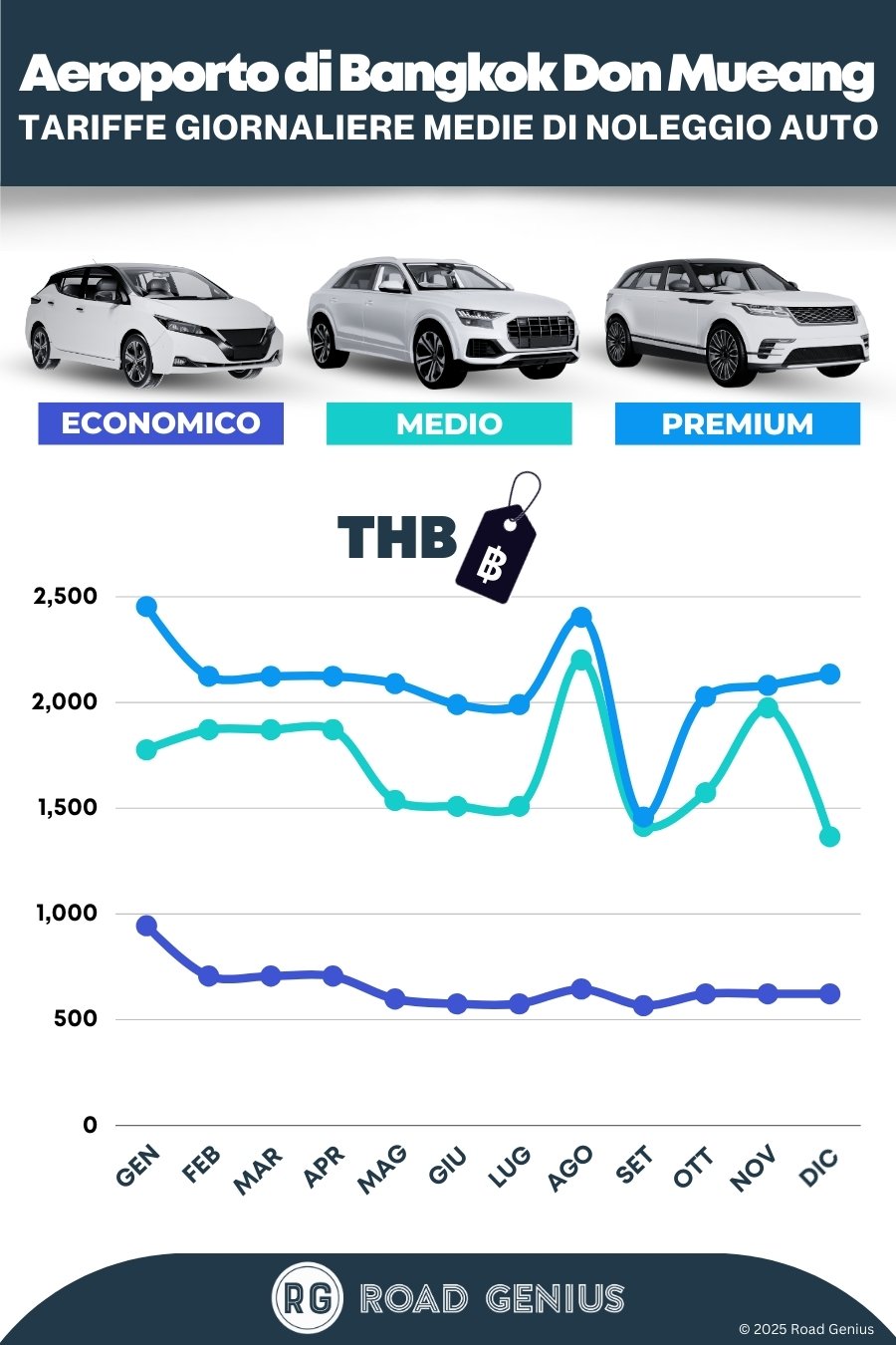 In media, il noleggio auto all'Aeroporto Don Mueang di Bangkok costa circa THB ฿1.482 al giorno, con tariffe a partire da THB ฿566 al giorno.