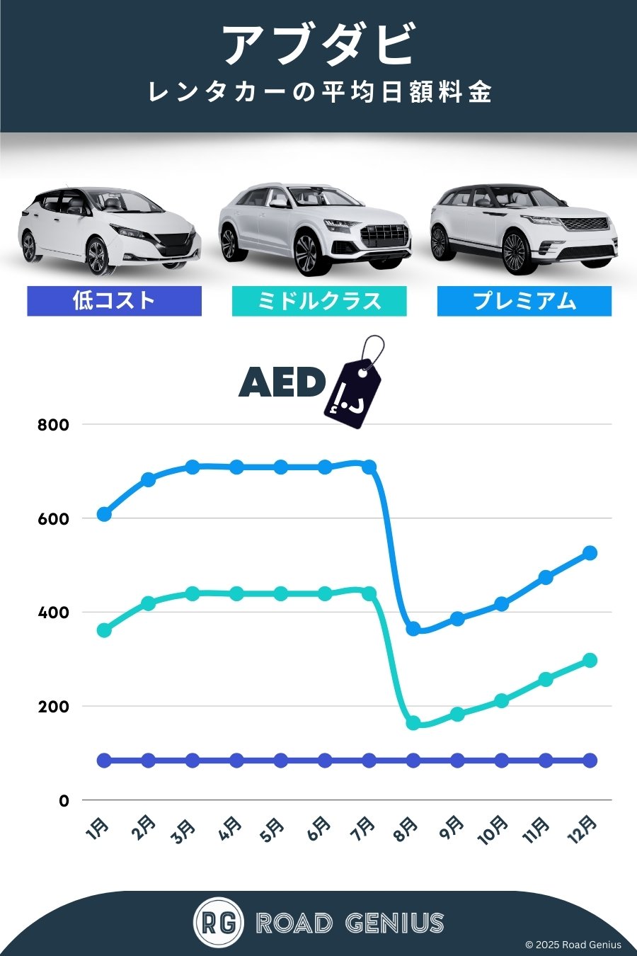 平均して、アブダビ のレンタカーは1日あたり 362 AED 前後で、最安のレンタルは1日あたり 39 AED から利用できます。