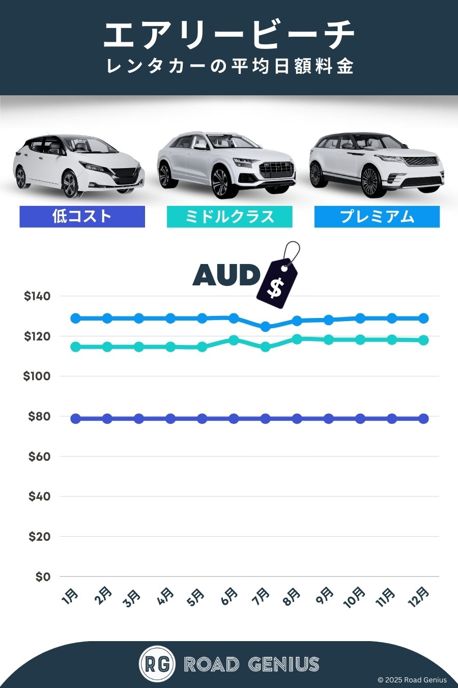 平均して、エアリービーチでのレンタカー料金は1日あたり約AUD $116で、最安料金は1日AUD $79から利用できます。