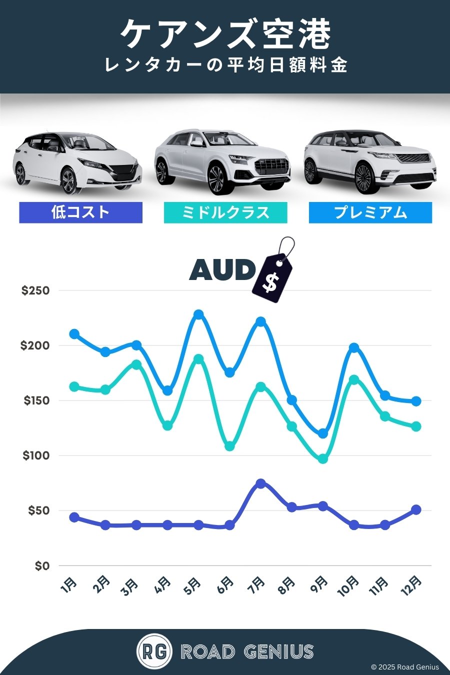 平均して、ケアンズ空港(CNS)でのレンタカー料金は1日あたり約AUD $159で、最安料金は1日AUD $37から利用できます。