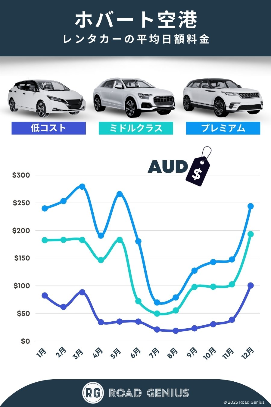平均して、ホバート空港(HBA)でのレンタカー料金は1日あたり約AUD $160で、最安料金は1日AUD $19から利用できます。