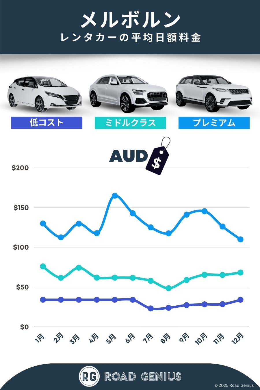 平均して、メルボルンでのレンタカー料金は1日あたり約AUD $104で、最安料金は1日AUD $23から利用できます。