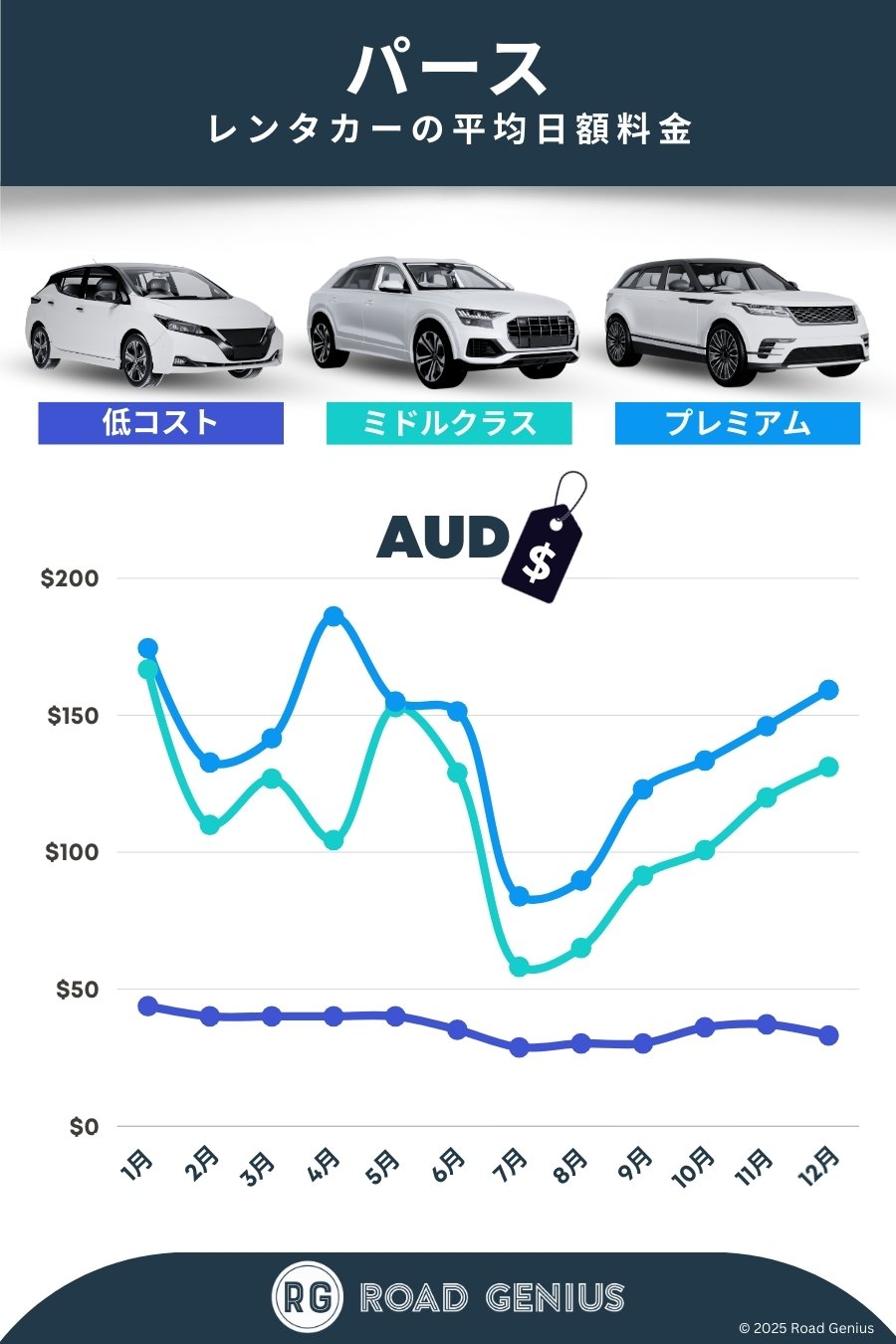 平均して、パースでのレンタカー料金は1日あたり約AUD $122で、最安料金は1日AUD $29から利用できます。