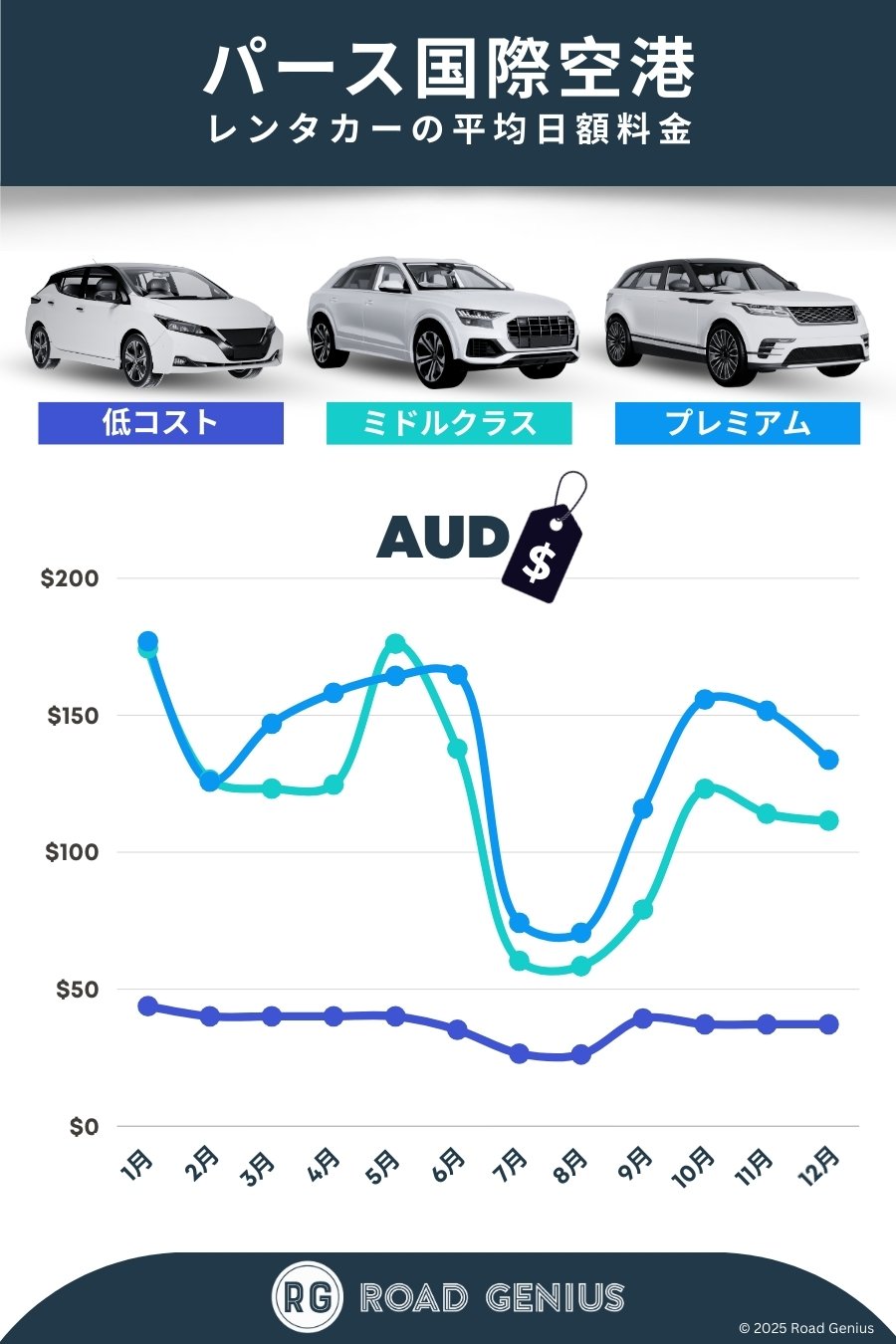 平均して、パース空港(PER)でのレンタカー料金は1日あたり約AUD $124で、最安料金は1日AUD $26から利用できます。