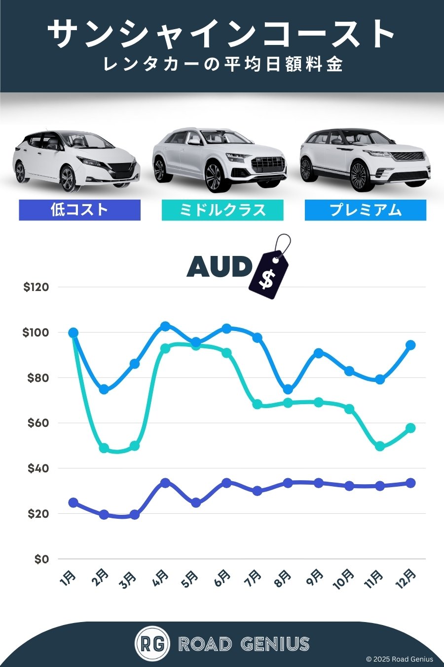 平均して、サンシャインコーストでのレンタカー料金は1日あたり約AUD $79で、最安料金は1日AUD $20から利用できます。