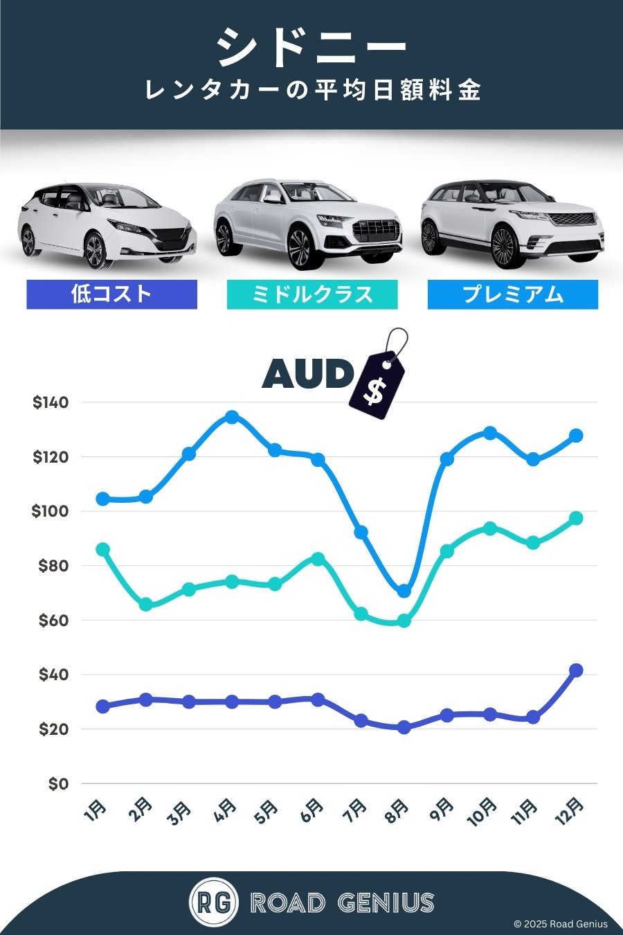 平均して、シドニーでのレンタカー料金は1日あたり約AUD $97で、最安料金は1日AUD $21から利用できます。