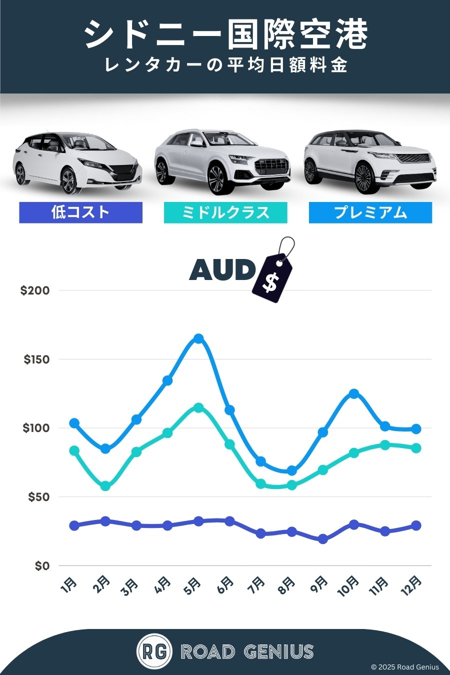 平均して、シドニー空港(SYD)でのレンタカー料金は1日あたり約AUD $93で、最安料金は1日AUD $19から利用できます。