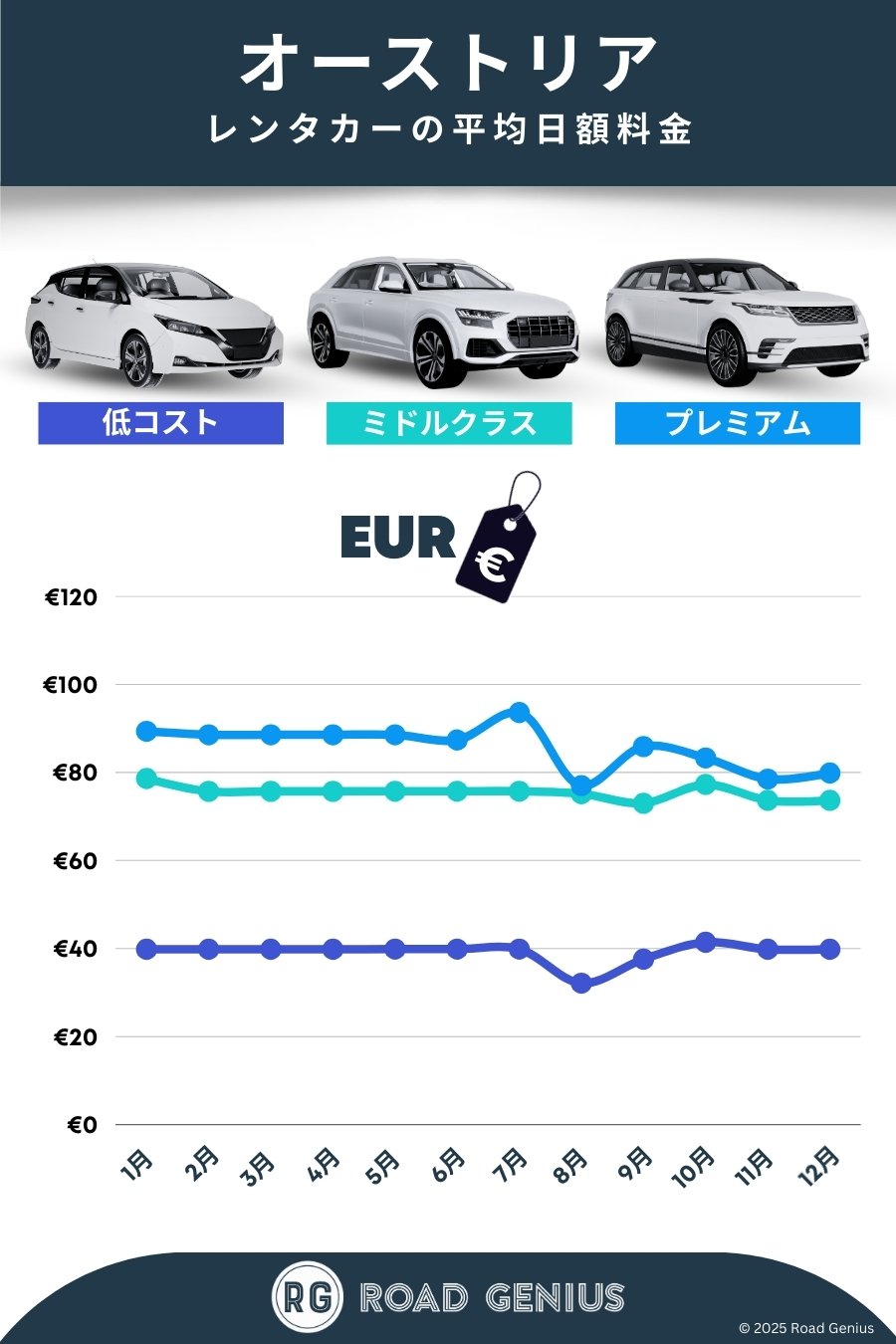 平均して、オーストリア のレンタカーは1日あたり€67前後で、最安のレンタルは1日あたり€32から利用できます。