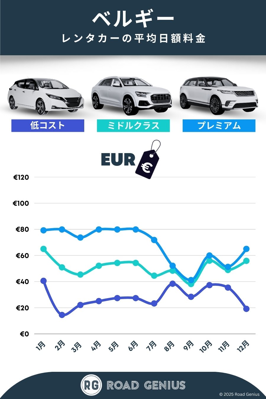 平均して、ベルギー のレンタカーは1日あたり€49前後で、最安のレンタルは1日あたり€14から利用できます。