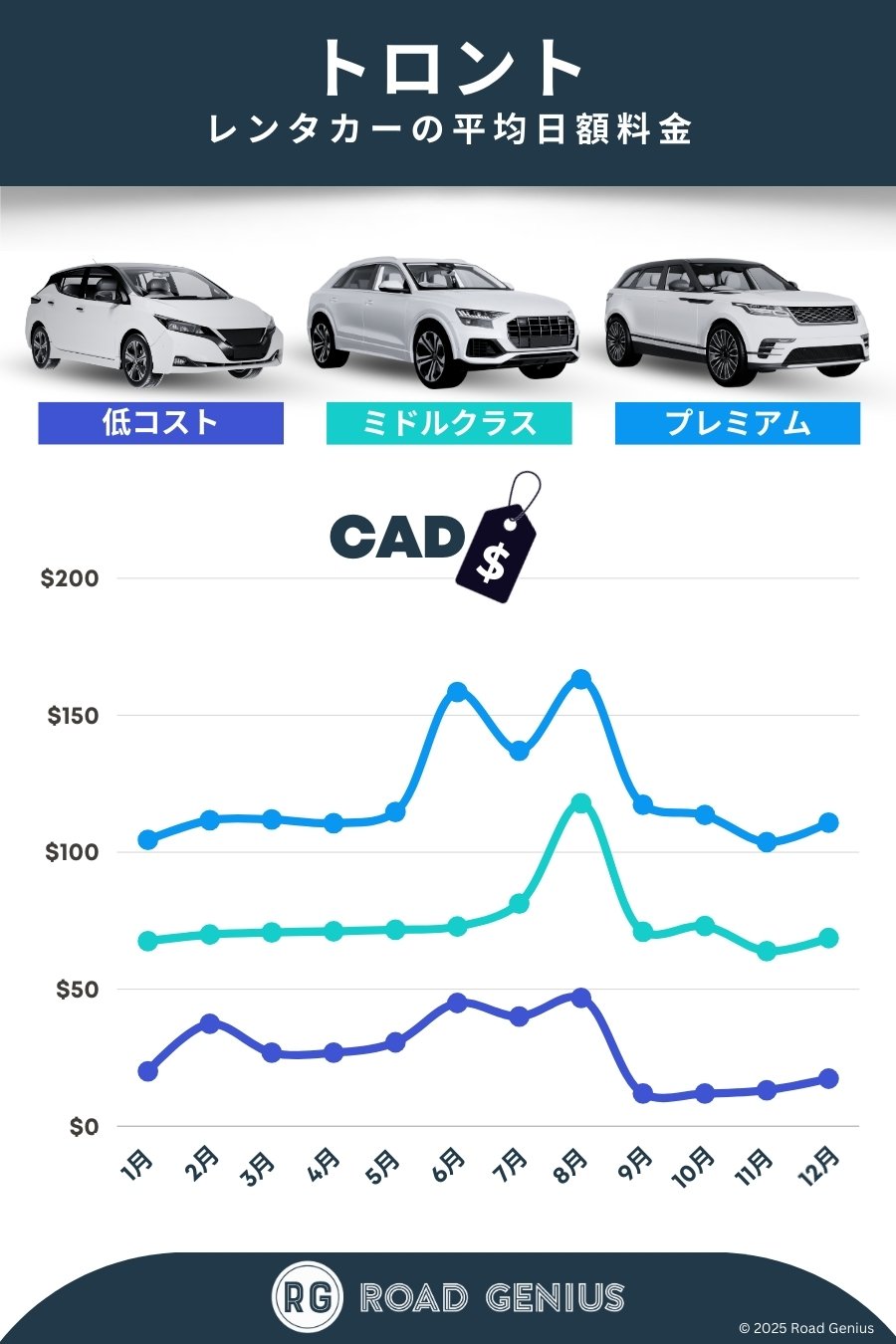 平均して、トロント のレンタカーは1日あたりCAD$75前後で、最安のレンタルは1日あたりCAD$12から利用できます。