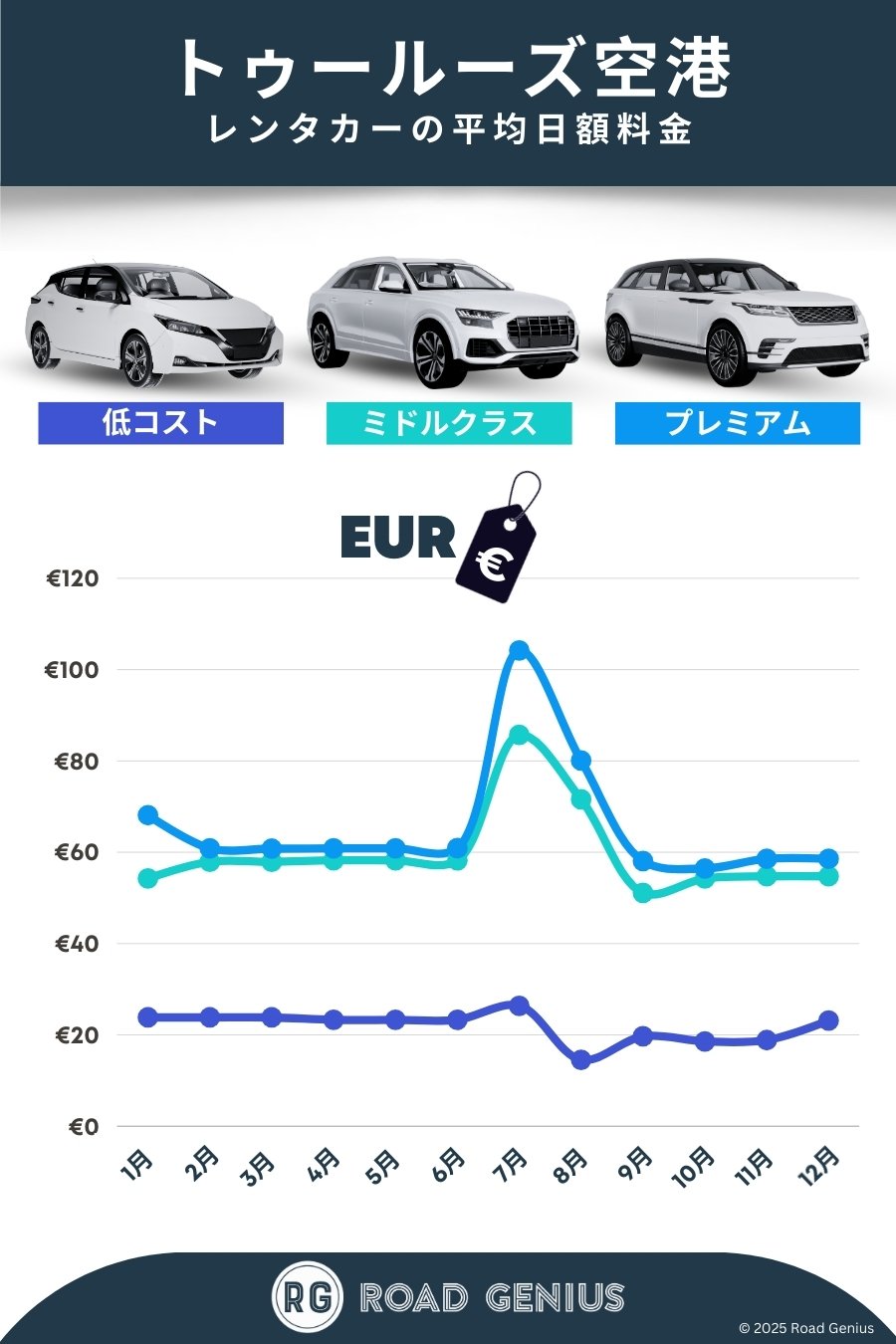 平均して、トゥールーズ空港 のレンタカーは1日あたり€49前後で、最安のレンタルは1日あたり€15から利用できます。