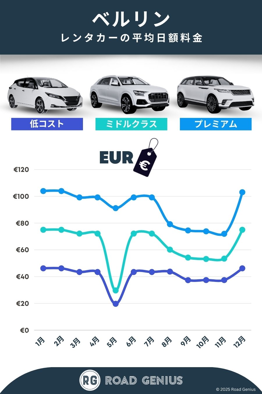 Road Geniusなら、ベルリンのレンタカーを簡単に検索・比較できます。ドイツ国内のレンタカー会社の料金を、予約手数料なしで一括比較。受け取り場所は、ベルリン・ブランデンブルク国際空港 (BER)やベルリン中央駅、市内中心部のアレクサンダー広場、クアフュルステンダム通りなどから選択可能です。エコノミー、SUV、電気自動車(EV)、バンなど豊富な車種からお選びいただけます。オートマ(AT)車、乗り捨て(ワンウェイ)、ポーランドへの越境といった条件での絞り込みもできます。夏や大規模イベントの時期は料金が上がりやすく予約も集中するため、早めの予約がおすすめです。