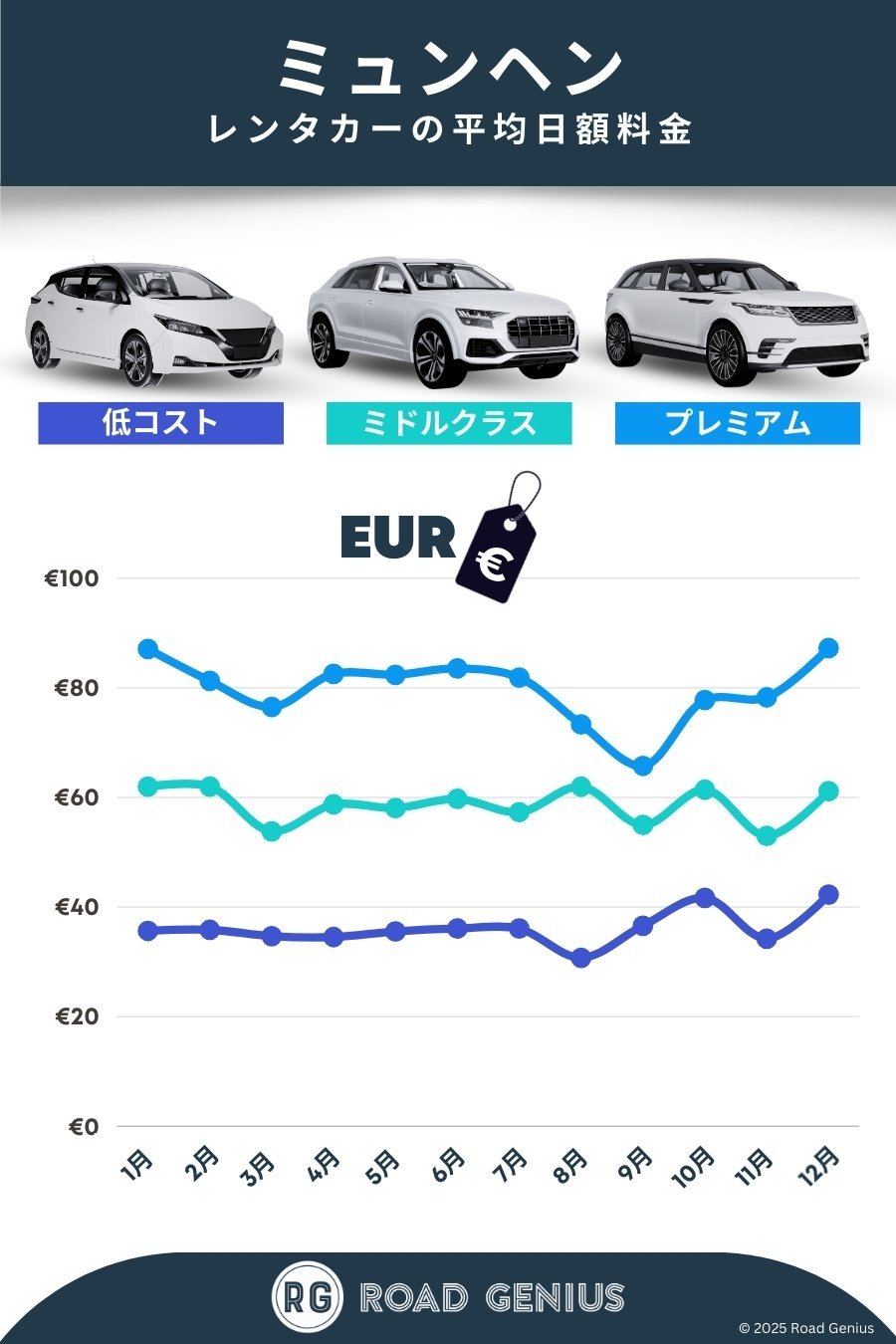 平均して、ミュンヘン のレンタカーは1日あたり€58前後で、最安のレンタルは1日あたり€31から利用できます。