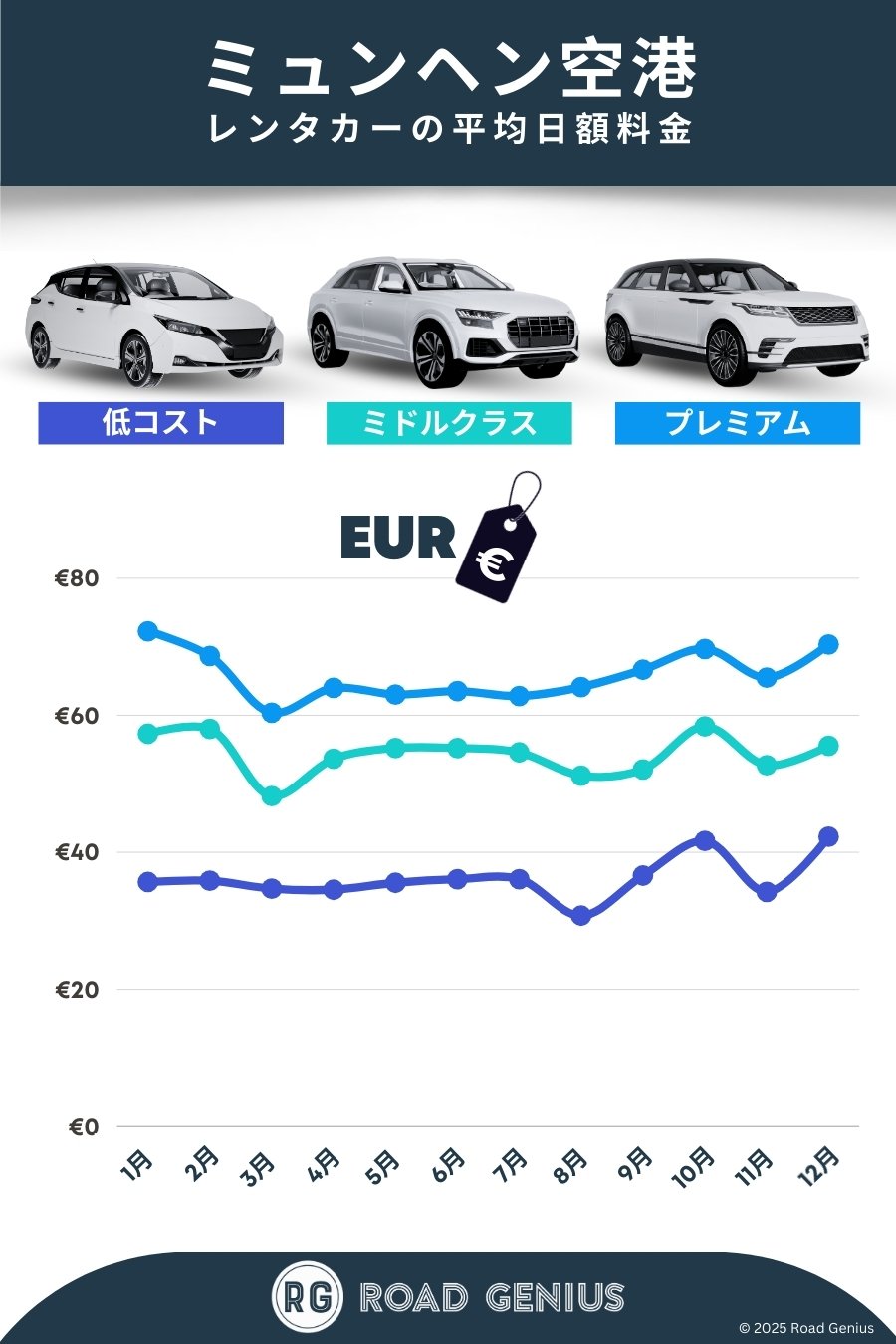 平均して、ミュンヘン空港 のレンタカーは1日あたり€52前後で、最安のレンタルは1日あたり€31から利用できます。