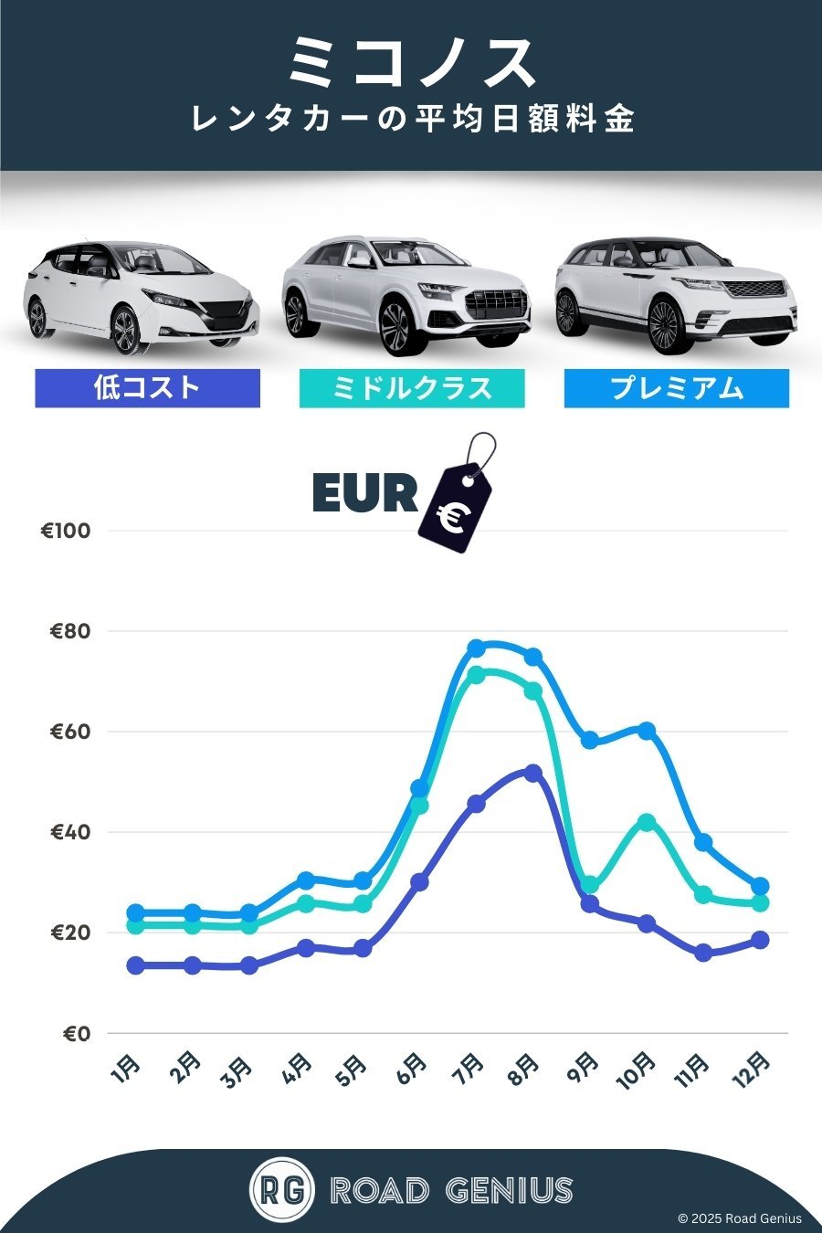 ミコノス島でのレンタカー探しなら、Road Geniusにおまかせください。ギリシャ全土のレンタカー会社の料金を、予約手数料なしで簡単に比較できます。ミコノス空港(JMK)や新港、ミコノスタウン中心部など、ご希望の場所でレンタカーの受け取りが可能です。島の狭い道に最適なコンパクトカーやオートマ車も豊富に揃っています。特に7月・8月のハイシーズンは混み合いますので、早めの予約でお得な料金と希望の車種を確保しましょう。