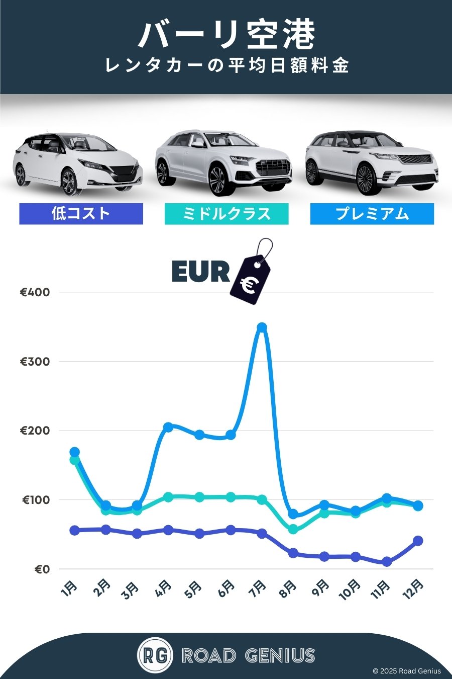 平均して、バーリ空港 のレンタカーは1日あたり€94前後で、最安のレンタルは1日あたり€11から利用できます。