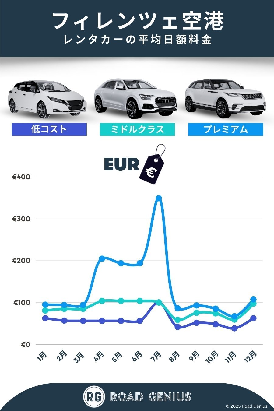 Road Geniusでは、フィレンツェ空港(FLR)の主要レンタカー会社の料金を簡単に比較できます。コンパクトカーから大人数で乗れるミニバン、高級SUVまで、旅のスタイルに合った一台を、お得な料金で簡単に見つけられます。
