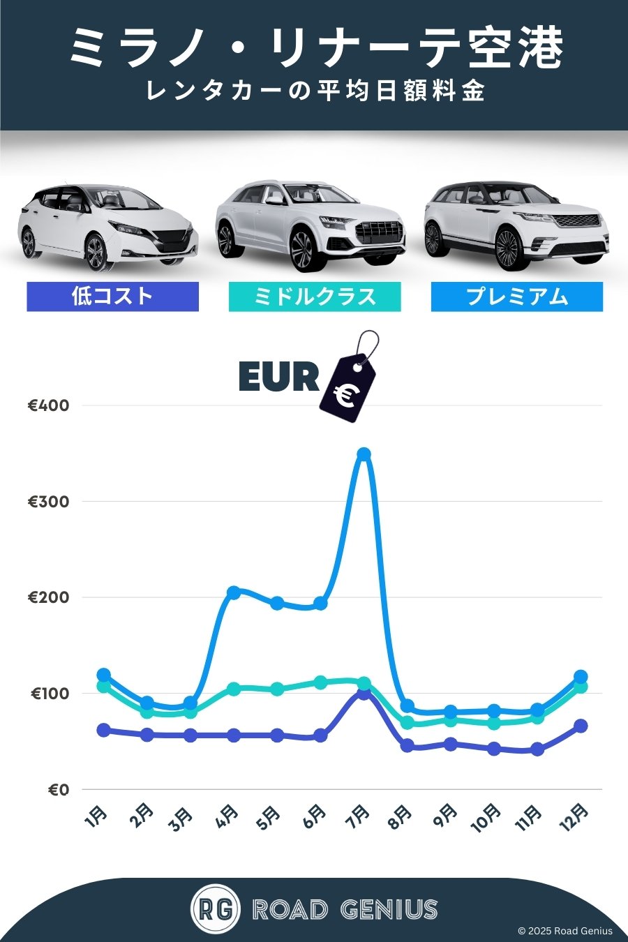 平均して、ミラノ・リナーテ空港 のレンタカーは1日あたり€96前後で、最安のレンタルは1日あたり€42から利用できます。