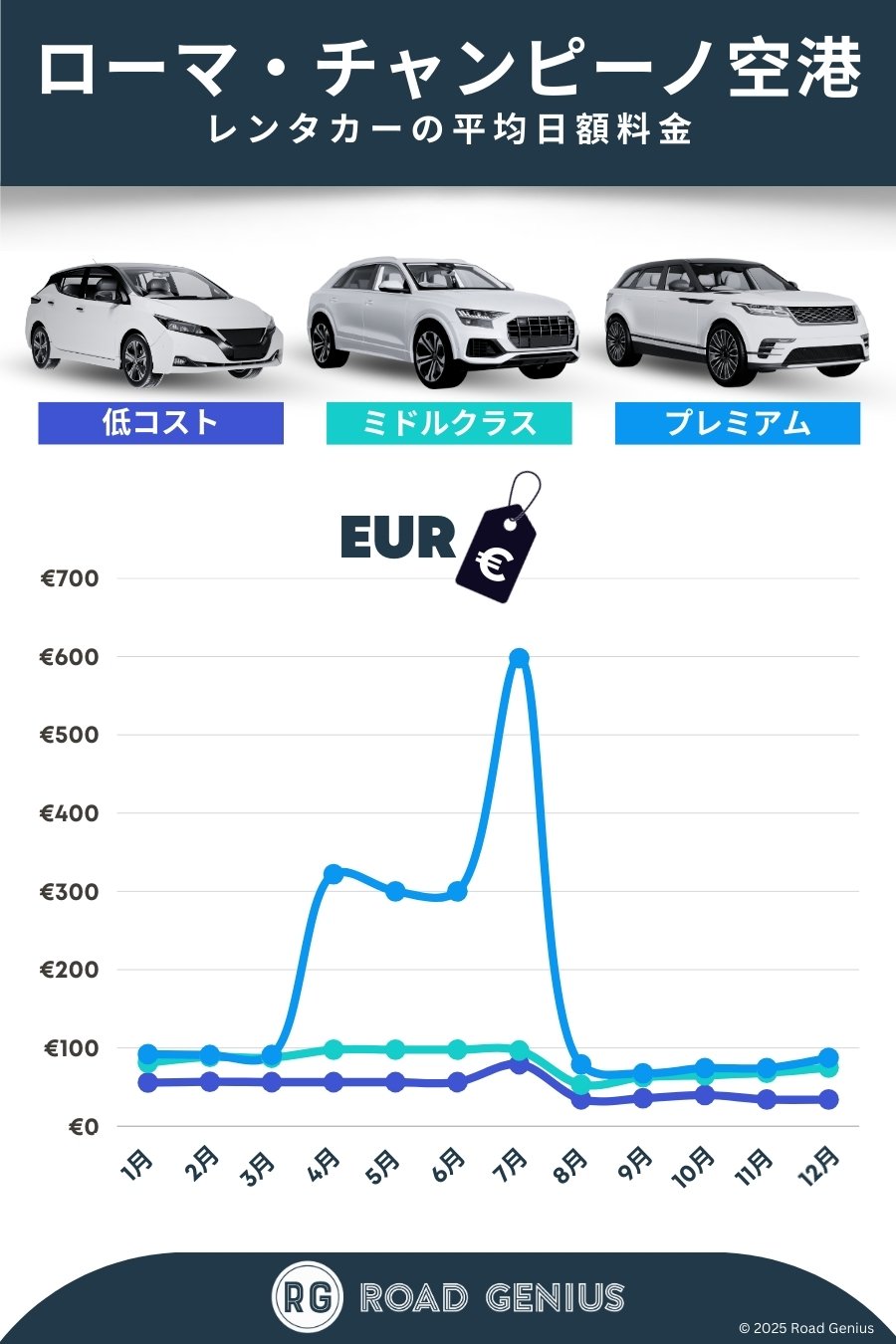 平均して、ローマ・チャンピーノ空港 のレンタカーは1日あたり€104前後で、最安のレンタルは1日あたり€34から利用できます。