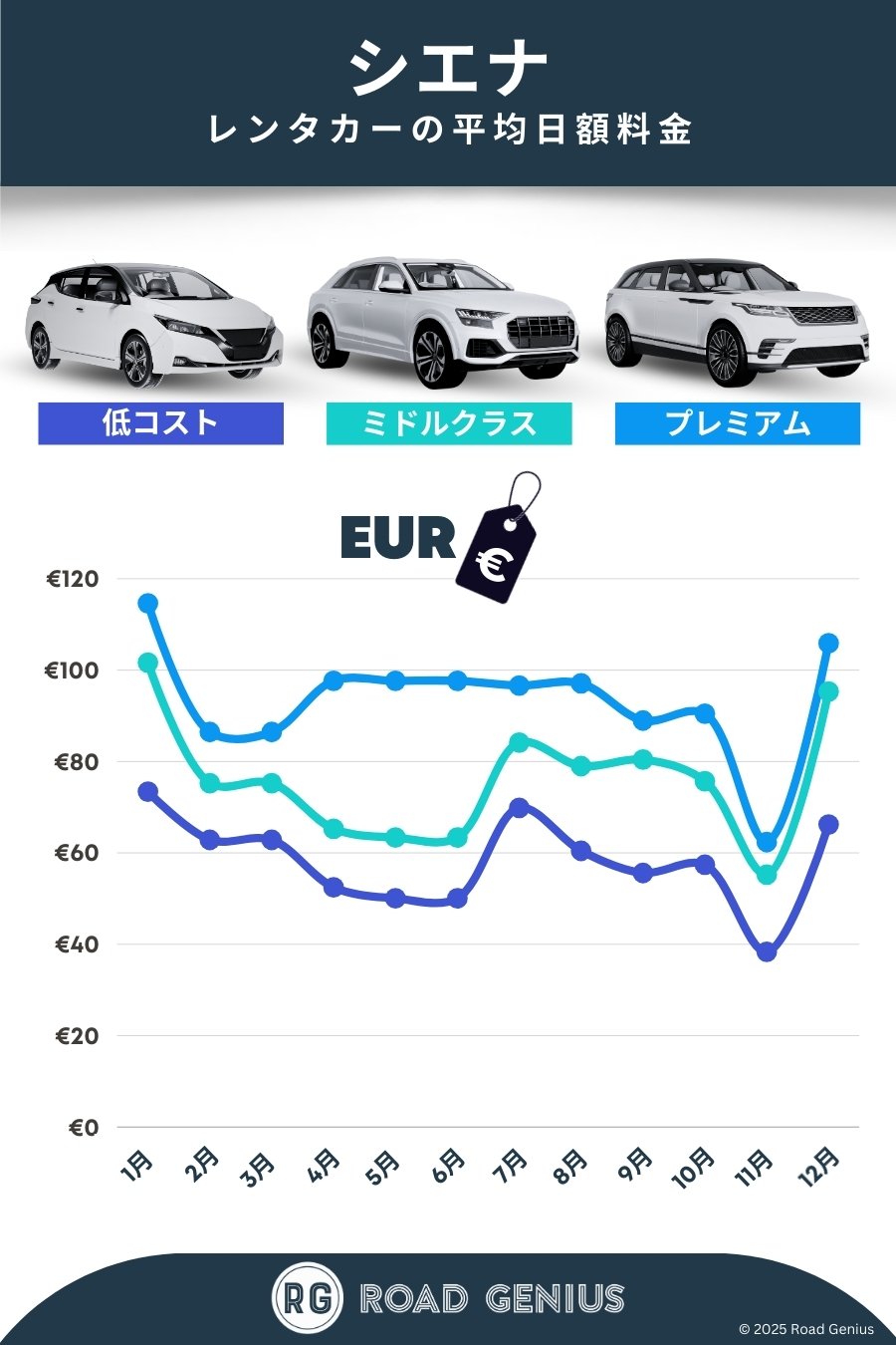 平均して、シエナ のレンタカーは1日あたり€76前後で、最安のレンタルは1日あたり€38から利用できます。
