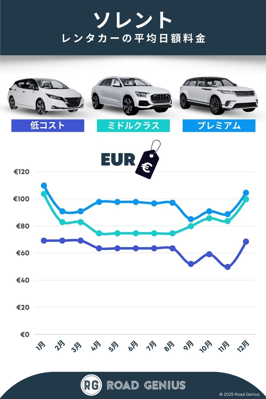 平均して、ソレント のレンタカーは1日あたり€80前後で、最安のレンタルは1日あたり€50から利用できます。