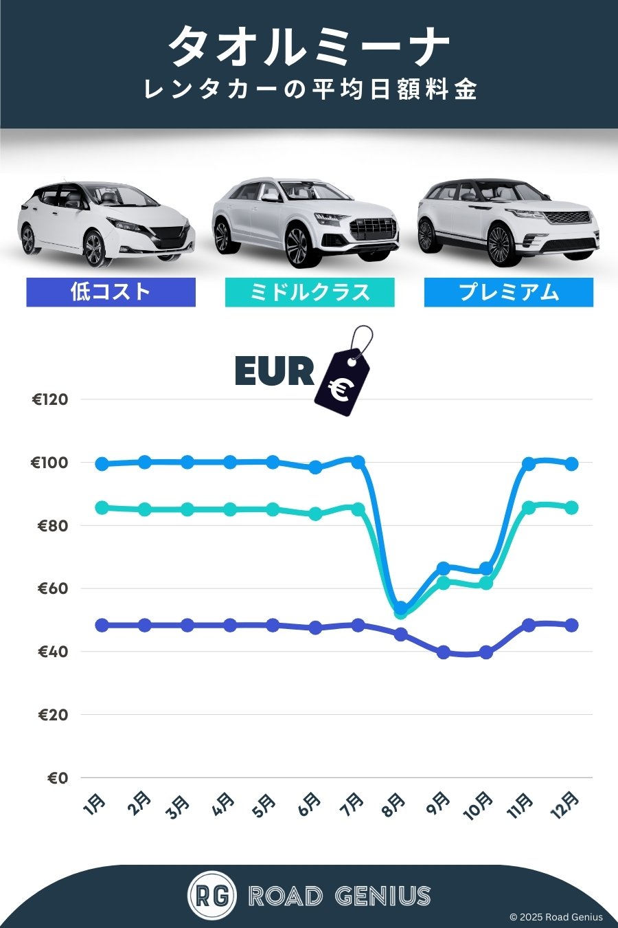 Road Geniusでは、タオルミーナのレンタカーを簡単に検索し、大手レンタカー会社の料金を比較できます。コンパクトカーからSUVやミニバンまで、幅広い車種をご用意。タオルミーナの便利な営業所で、お得なレンタカーを見つけましょう。