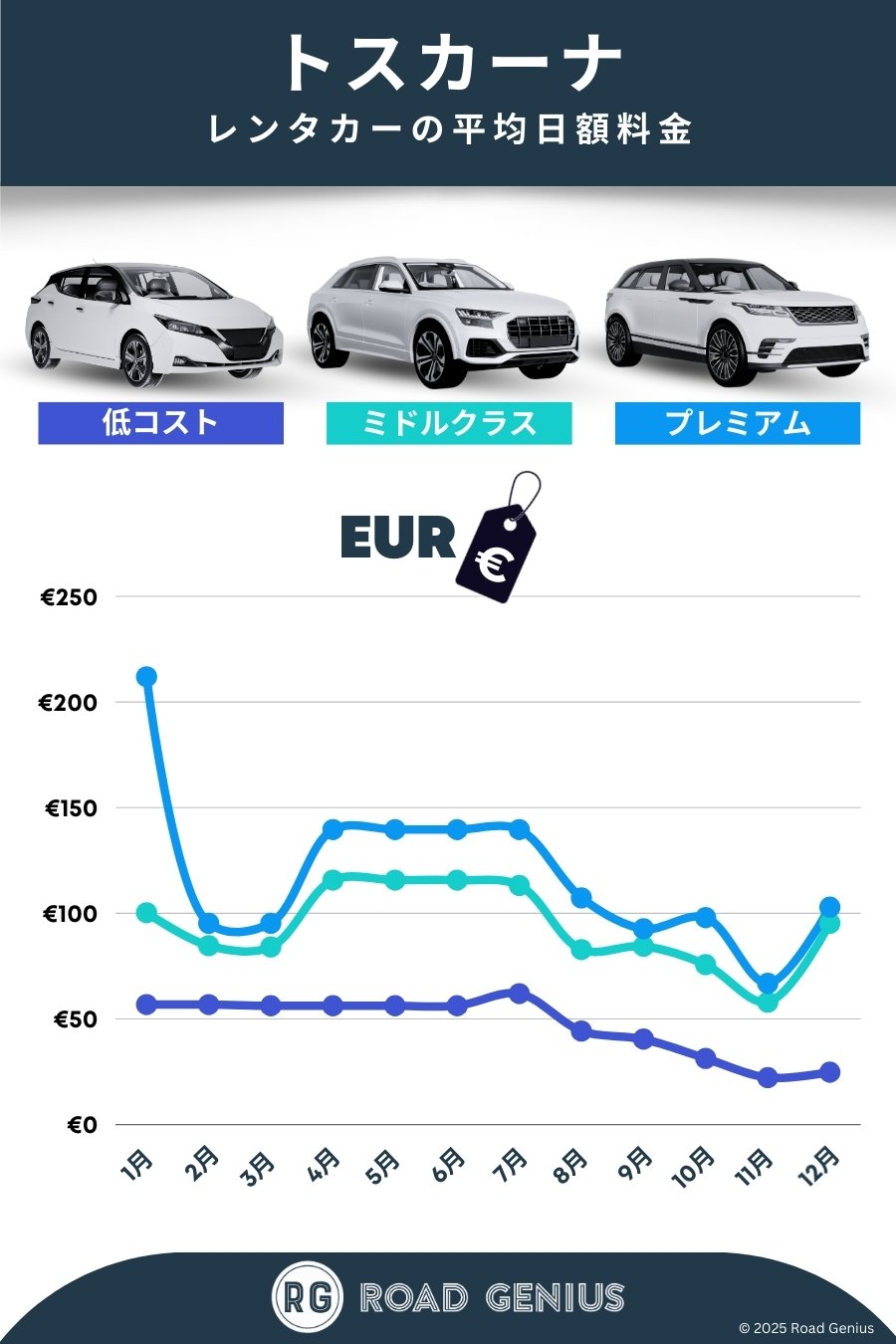 平均して、トスカーナ のレンタカーは1日あたり€87前後で、最安のレンタルは1日あたり€22から利用できます。