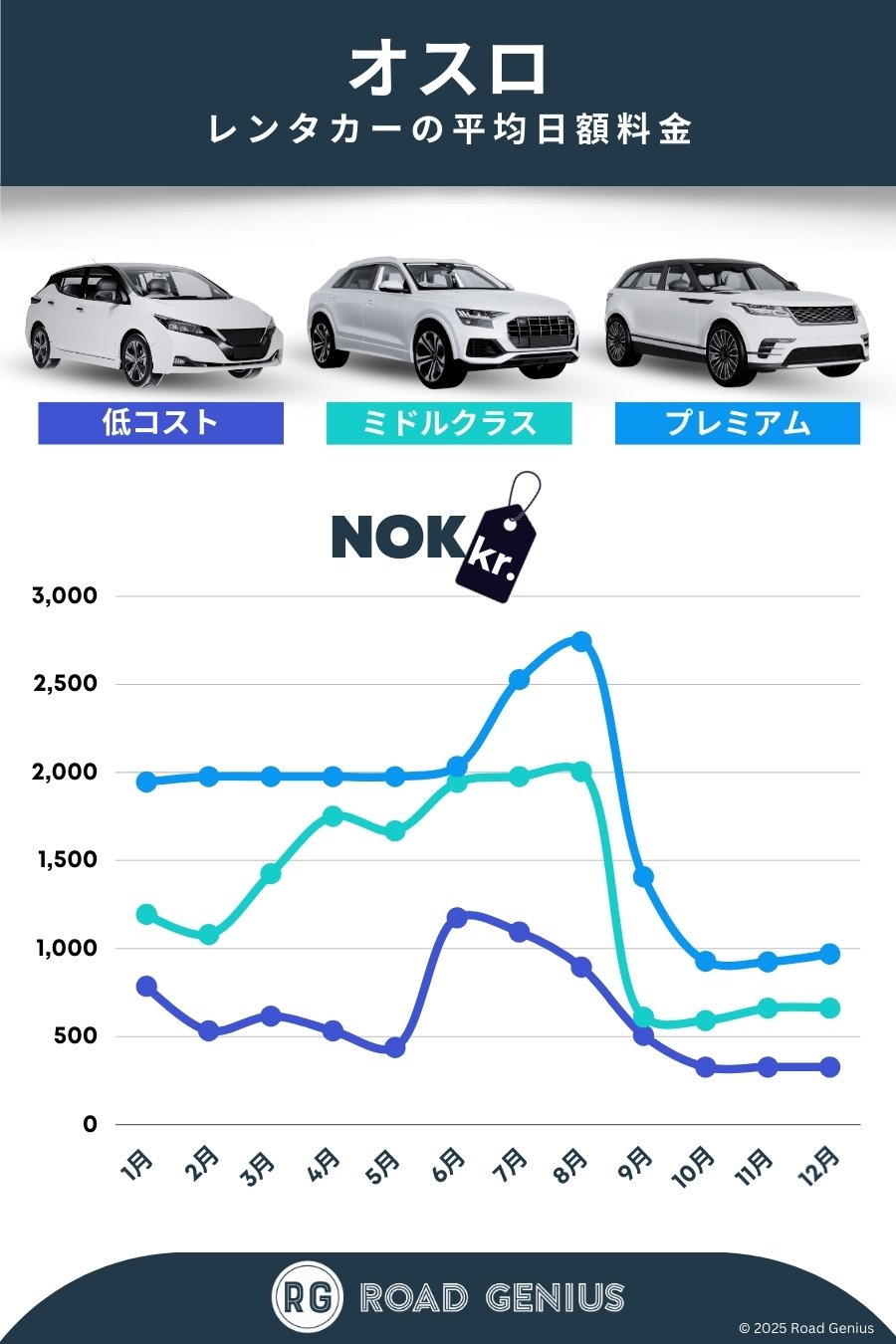 平均して、オスロ のレンタカーは1日あたり1,236 kr前後で、最安のレンタルは1日あたり327 krから利用できます。