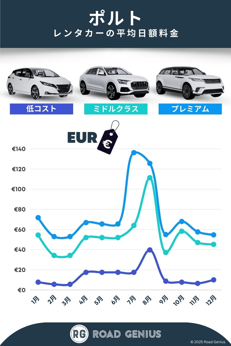 平均して、ポルト のレンタカーは1日あたり€47前後で、最安のレンタルは1日あたり€6から利用できます。