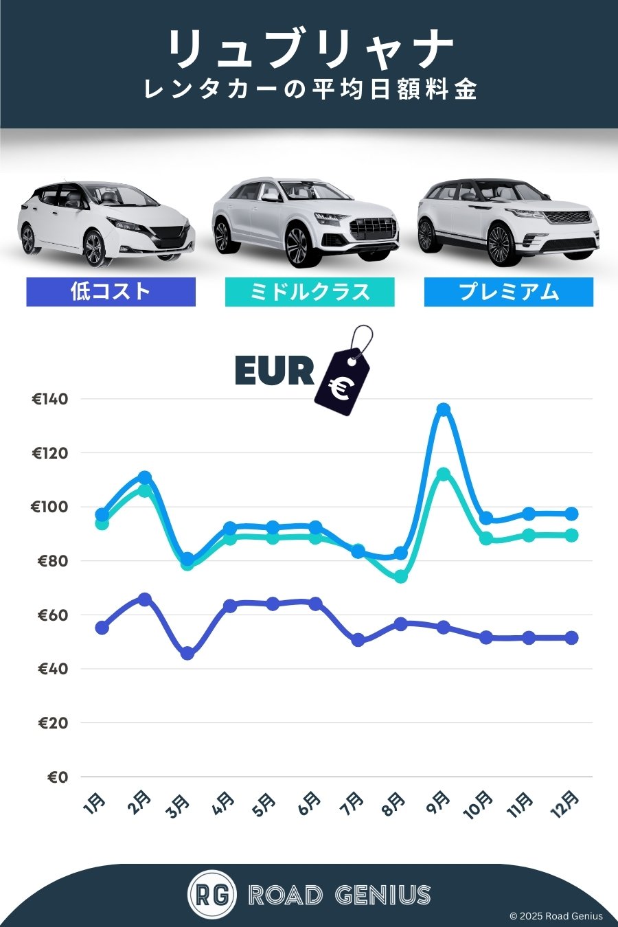 平均して、リュブリャナ のレンタカーは1日あたり€81前後で、最安のレンタルは1日あたり€46から利用できます。