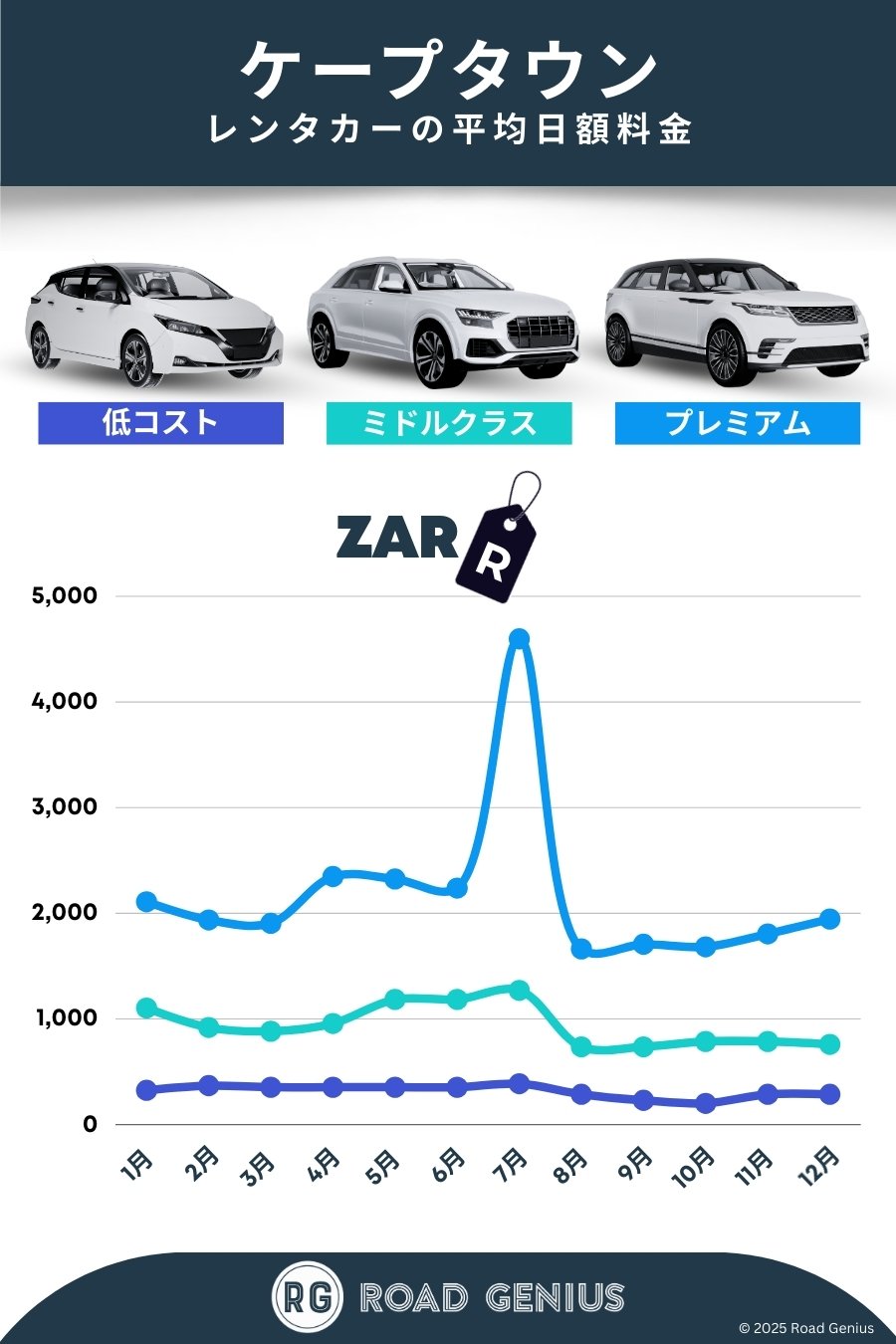 平均して、ケープタウン のレンタカーは1日あたりZAR 1,149前後で、最安のレンタルは1日あたりZAR 201から利用できます。