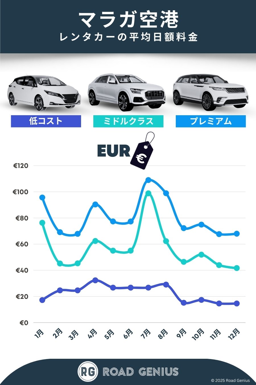 平均して、マラガ空港 のレンタカーは1日あたり€53前後で、最安のレンタルは1日あたり€15から利用できます。