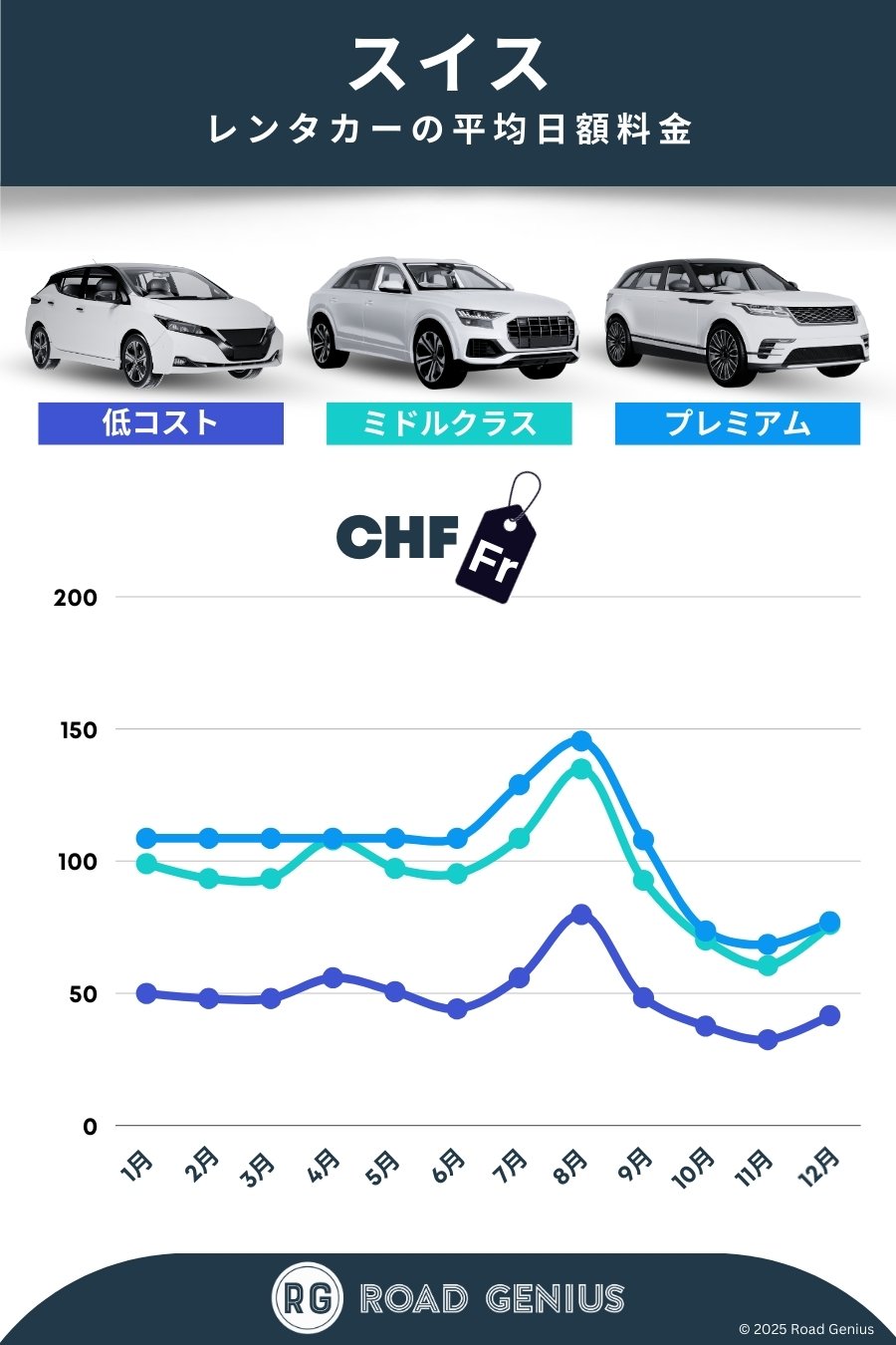 平均して、スイス のレンタカーは1日あたりCHF 83前後で、最安のレンタルは1日あたりCHF 32から利用できます。