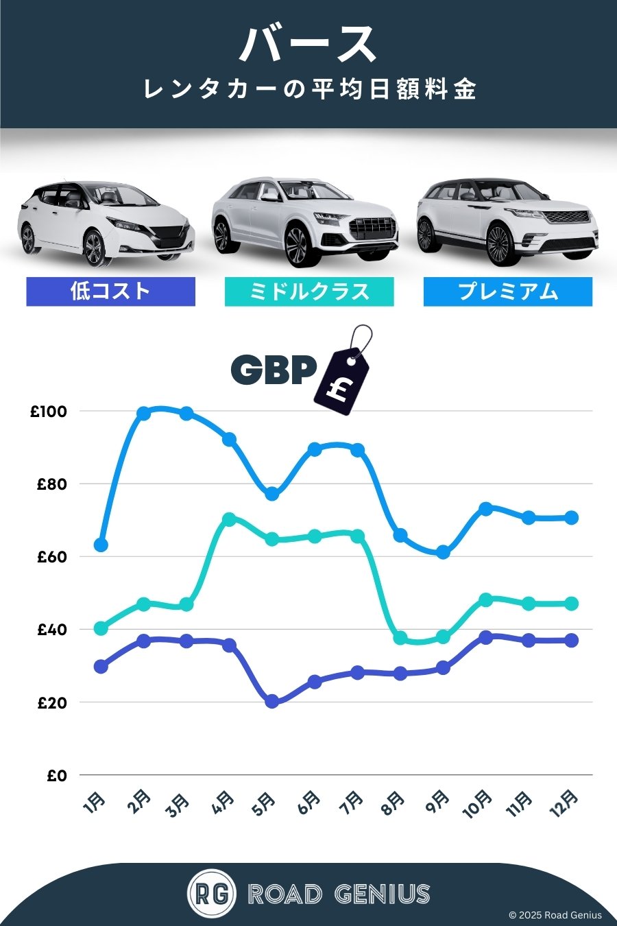 イギリスではマニュアル車が主流のため、オートマ車は通常1日あたり5〜10ポンドほど高くなります。また、エコノミーカーは料金が安いですが、バース市内では在庫が限られているため、お得なプランを見つけたら早めに予約するのがおすすめです。