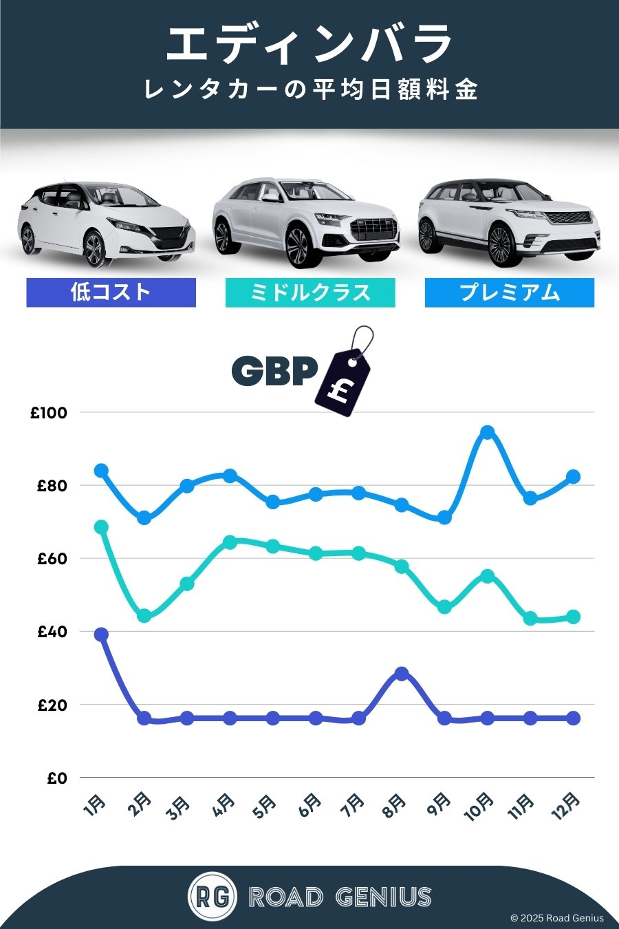 平均して、エディンバラ のレンタカーは1日あたり€51前後で、最安のレンタルは1日あたり€16から利用できます。