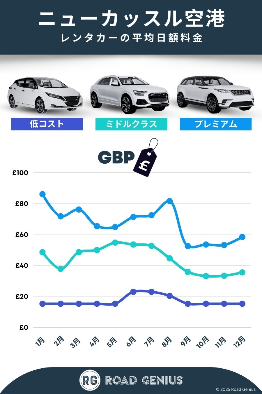 平均して、ニューカッスル空港 のレンタカーは1日あたり€55前後で、最安のレンタルは1日あたり€12から利用できます。