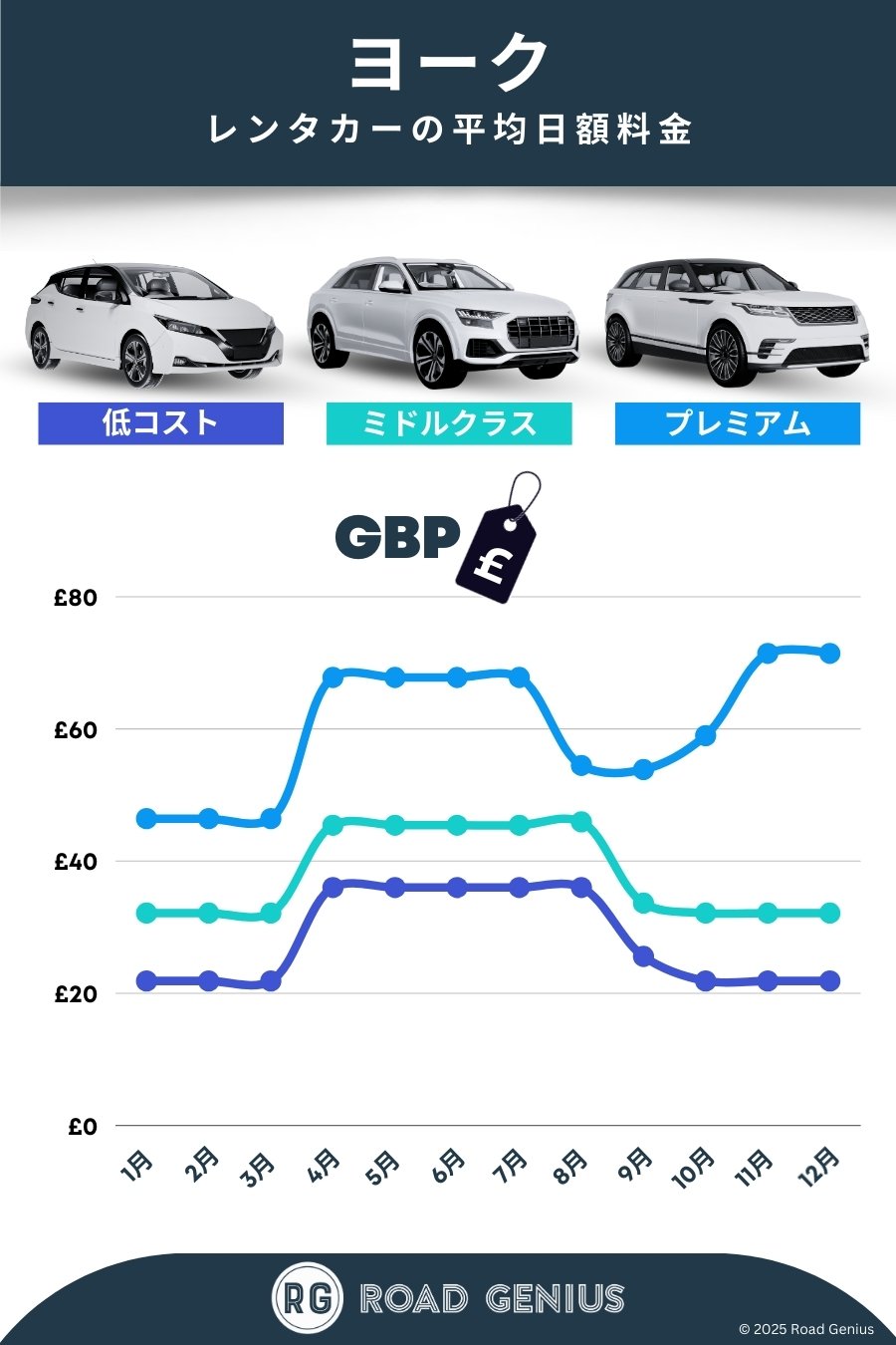 平均して、ヨーク のレンタカーは1日あたり€42前後で、最安のレンタルは1日あたり€22から利用できます。