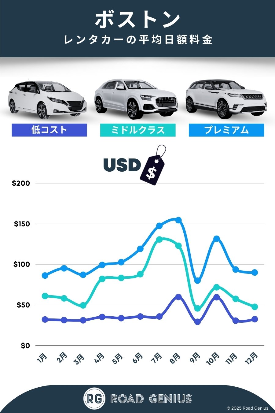 平均して、ボストン のレンタカーは1日あたりUSD$73前後で、最安のレンタルは1日あたりUSD$29から利用できます。