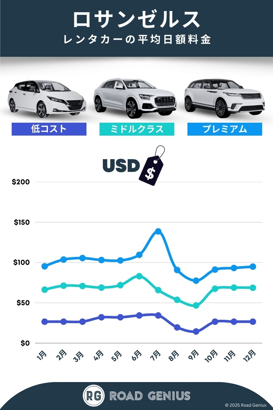 オフシーズンを狙う ロサンゼルスのレンタカー料金は、夏と祝日や連休中に最も高くなります。可能であれば、料金が下がる10月〜11月や1月〜2月が狙い目です。