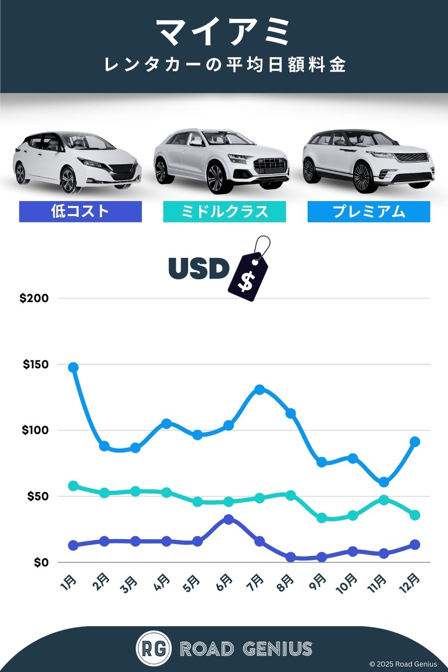 平均して、マイアミ のレンタカーは1日あたりUSD$53前後で、最安のレンタルは1日あたりUSD$4から利用できます。