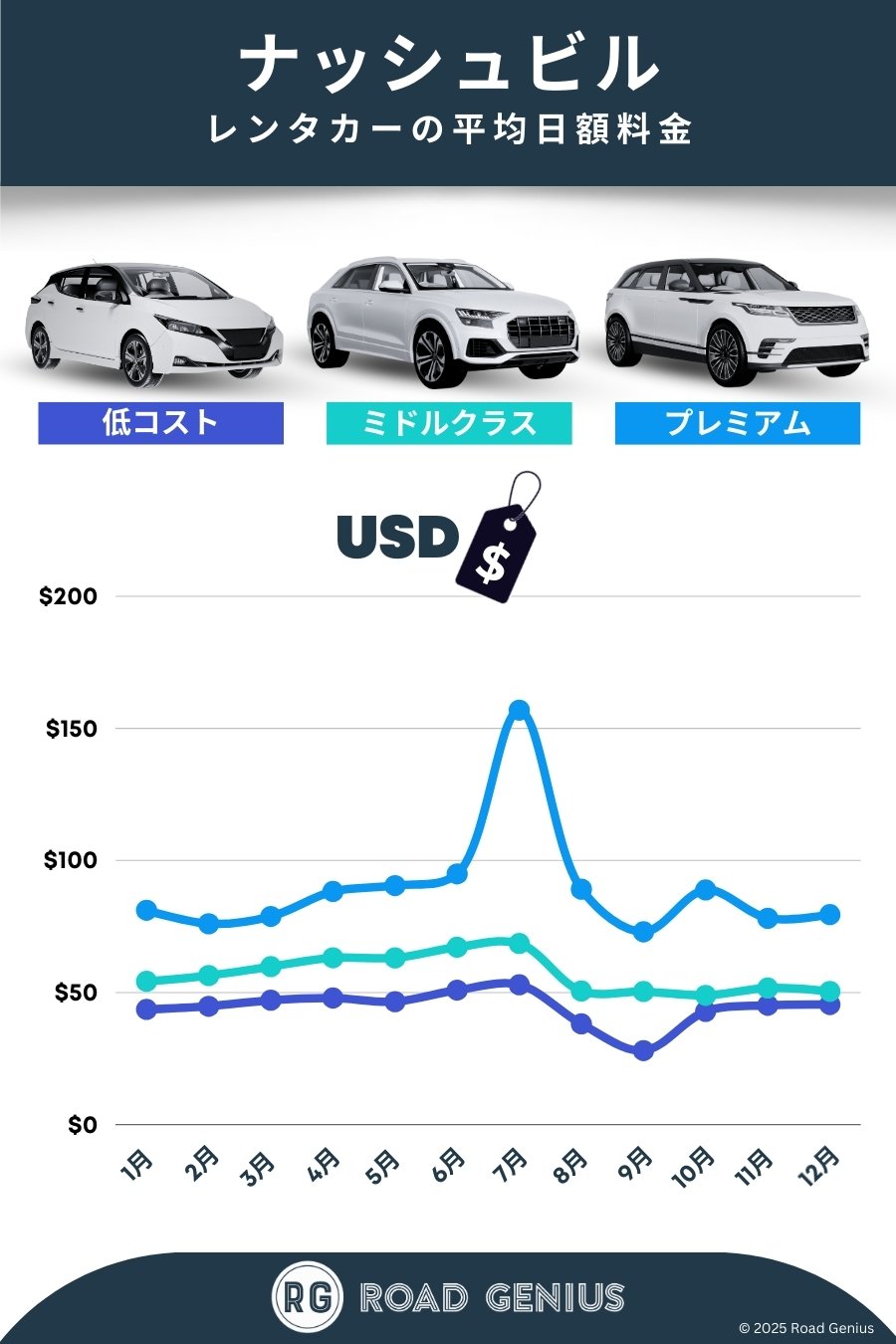 平均して、ナッシュビル のレンタカーは1日あたりUSD$64前後で、最安のレンタルは1日あたりUSD$28から利用できます。