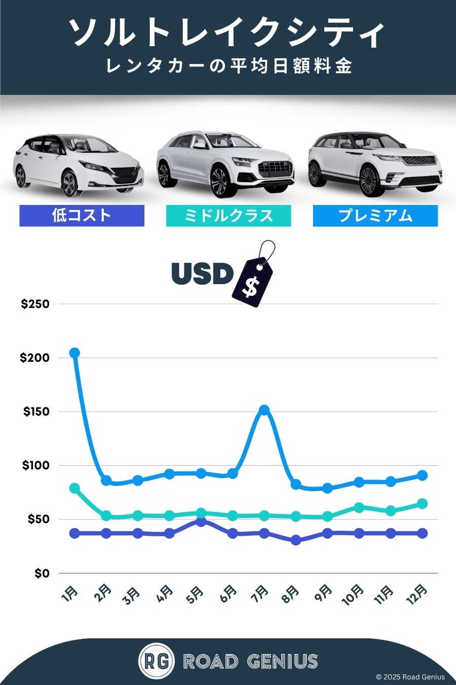 平均して、ソルトレイクシティ のレンタカーは1日あたりUSD$66前後で、最安のレンタルは1日あたりUSD$31から利用できます。