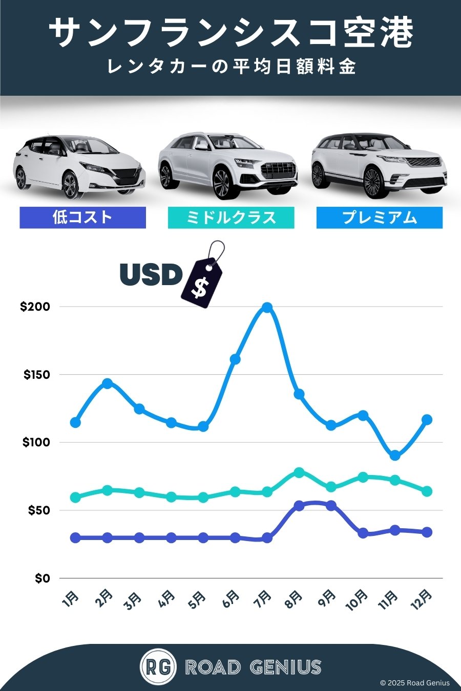 平均して、サンフランシスコ空港 のレンタカーは1日あたりUSD$76前後で、最安のレンタルは1日あたりUSD$30から利用できます。