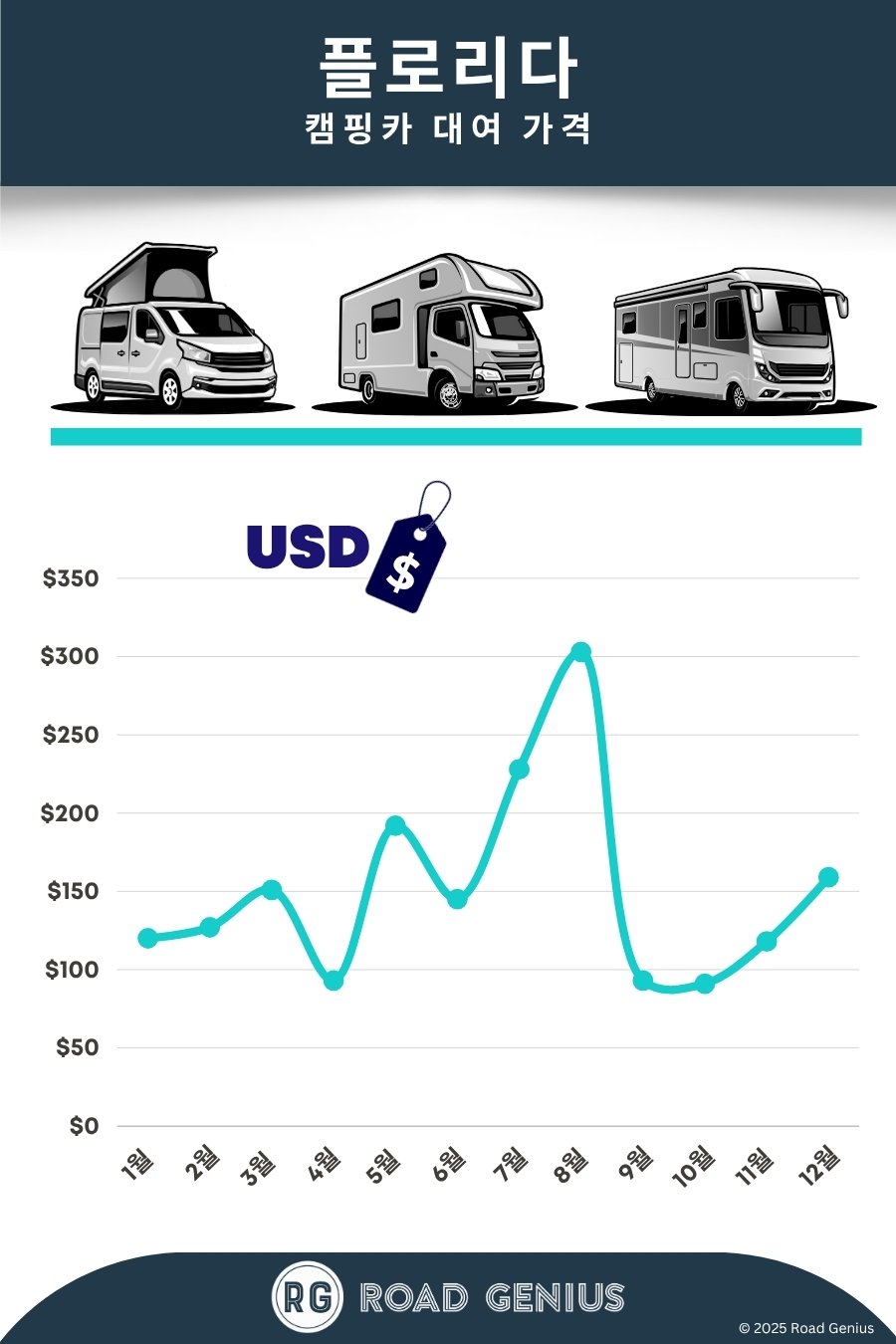 Road Genius에서 여러 캠퍼밴 및 모터홈 렌트 업체를 비교해서 플로리다 로드 트립에 맞는 차량을 찾아보세요. 대부분 여행자들은 마이애미나 올랜도, 탬파에서 픽업해서 플로리다의 해변과 샘, 국립공원을 돌아봅니다. 플로리다는 겨울이 온화하고 여름이 덥고 습하며, 6월~11월은 허리케인 시즌입니다.