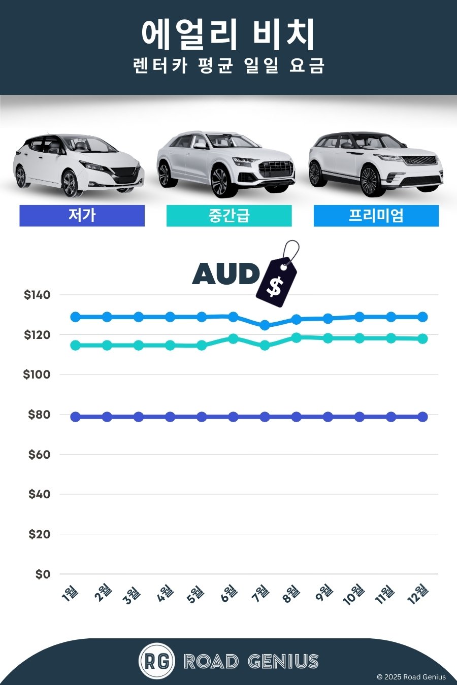 에얼리 비치의 렌터카 평균 요금은 하루 약 AUD $116이며, 최저 요금은 AUD $79부터입니다.