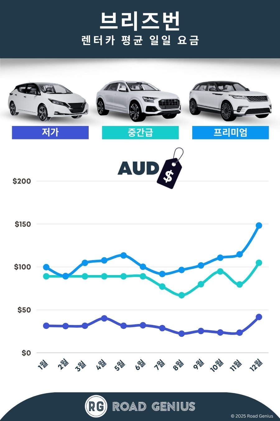 브리즈번의 렌터카 평균 요금은 하루 약 AUD $95이며, 최저 요금은 AUD $22부터입니다.