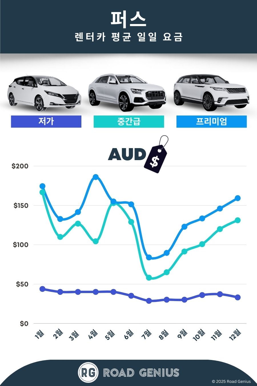 퍼스의 렌터카 평균 요금은 하루 약 AUD $122이며, 최저 요금은 AUD $29부터입니다.