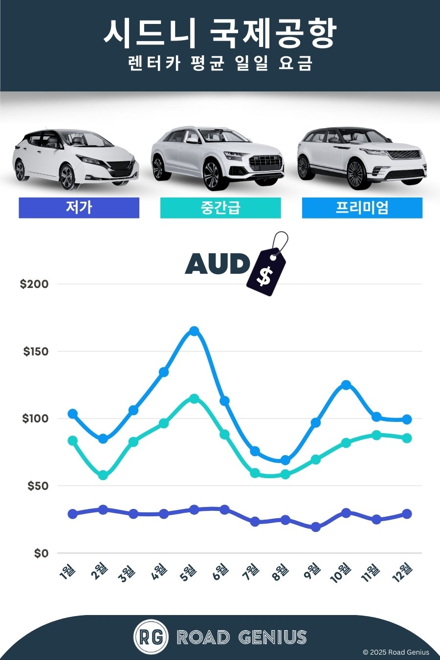 시드니 공항(SYD)의 렌터카 평균 요금은 하루 약 AUD $93이며, 최저 요금은 AUD $19부터입니다.